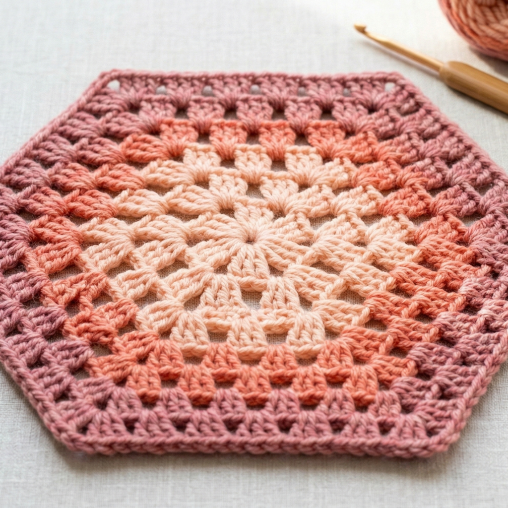 Finished size (sample): 6–7″ hexagon with DK & 4.0 mm hook