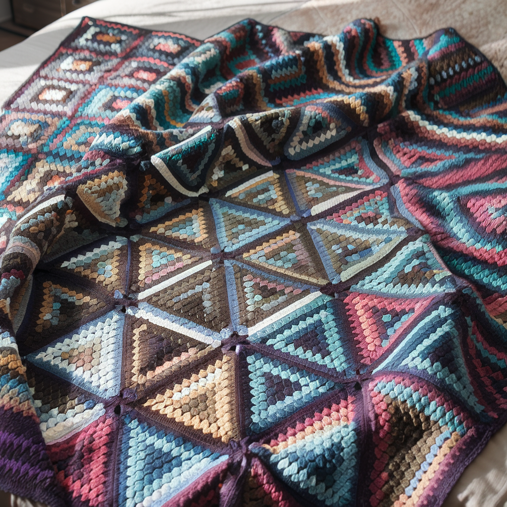 - Round 2–5: Use DC increases to square off into a small 6×6 block, switching yarn colors to create diamond insets (use tapestry technique or mosaic slip st-stitch).