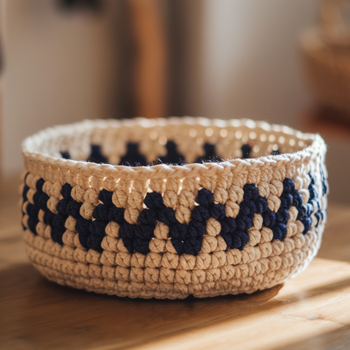 - Weave in all ends and optionally line the inside with fabric (cut a round base + rectangular side strip and sew to fit) to protect yarn and give a polished finish.