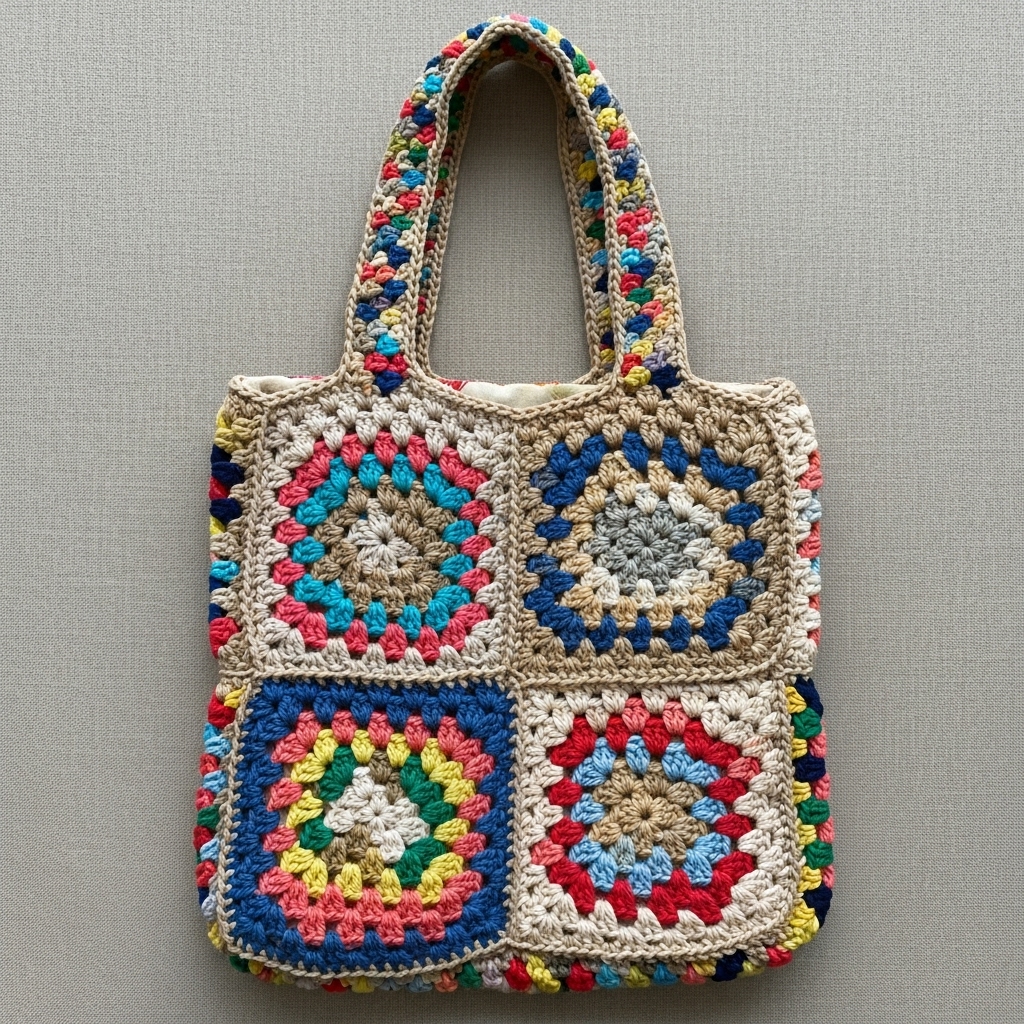 - Make granny squares — classic or large 4-round granny squares. Make 8 squares (4 for front/back when joined in 2×2) to create the bag body — or 6 for a long tote (3×2). Aim for squares ~6″–7″.