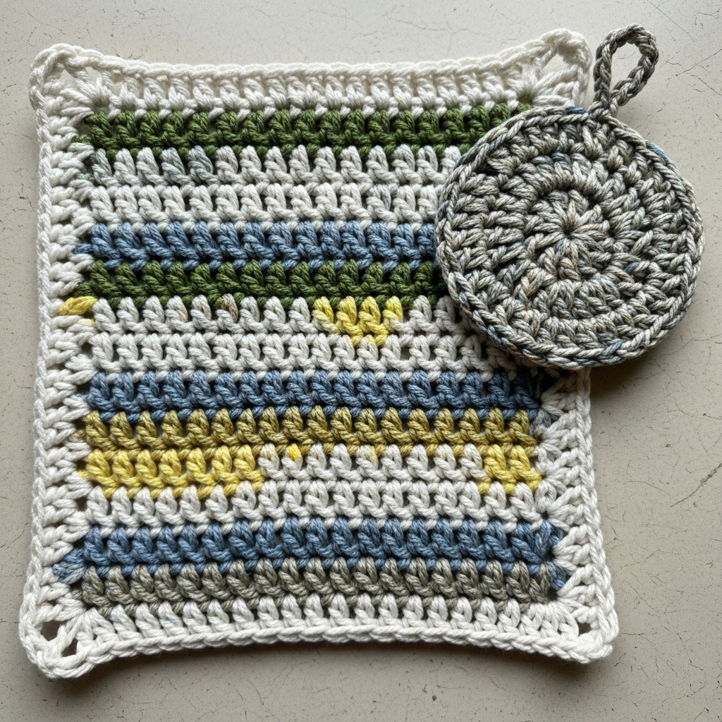 Finished size (approx): 8″ × 8″ square or 4–5″ scrubbie