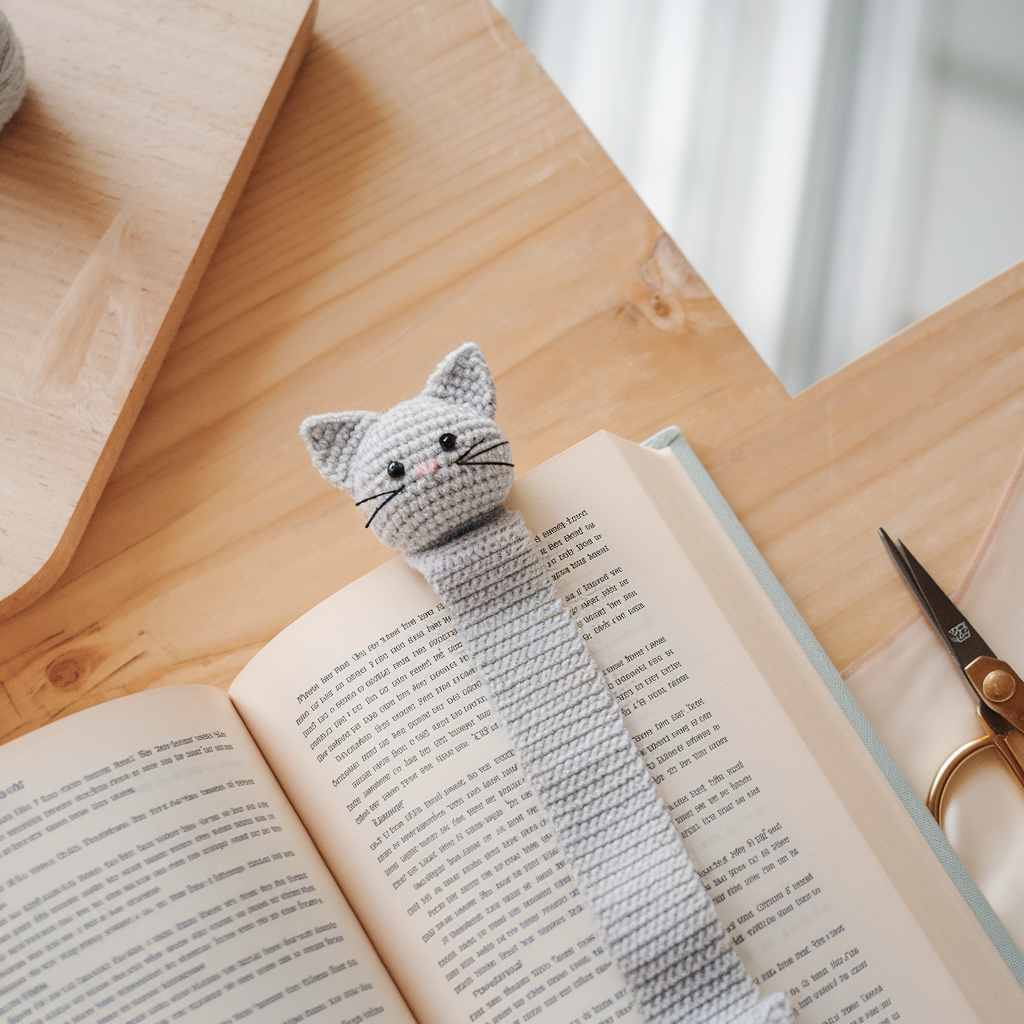 - Face embroidery: Using contrasting yarn, embroid small eyes (two French knots or tiny sl st), a small upside-down triangle nose (small satin stitch), and 3 whiskers each side (straight stitches). Keep details tiny so they don’t catch pages.