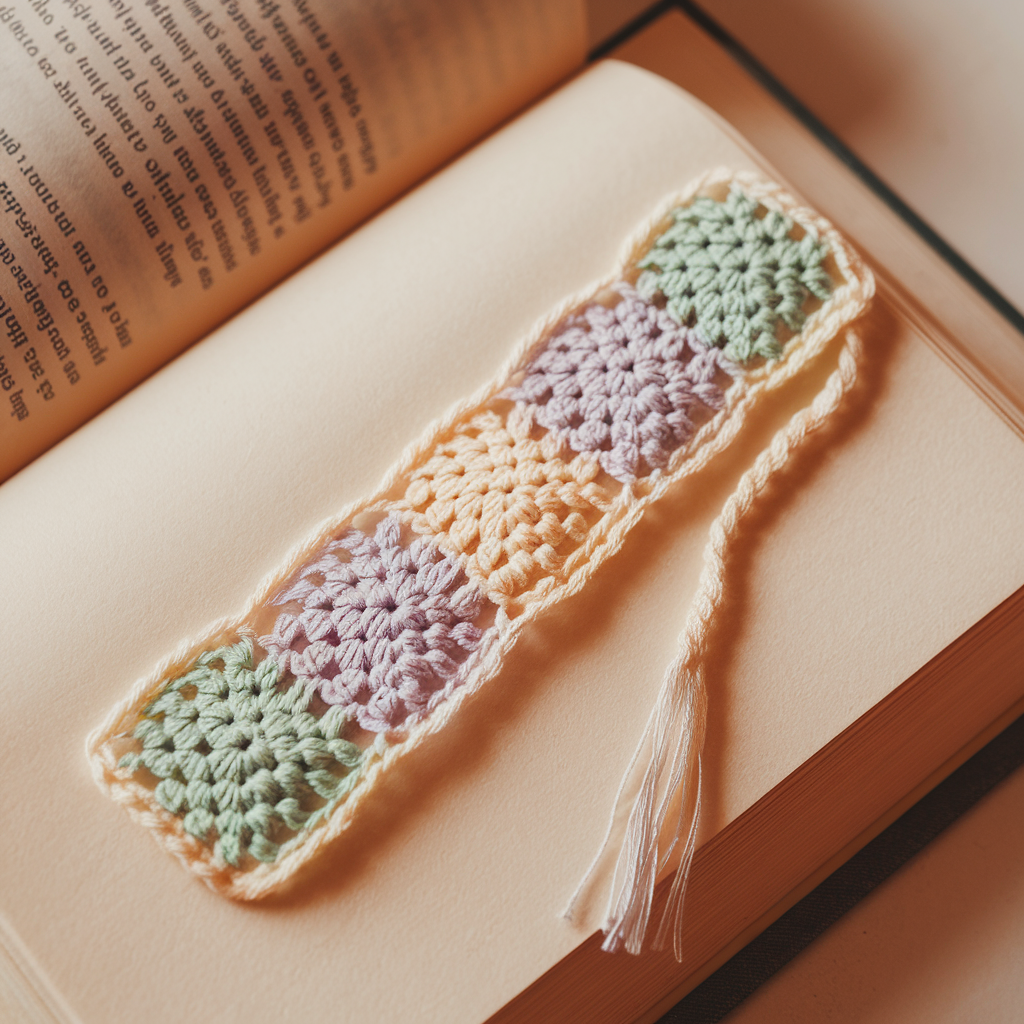 Finished size: Each granny square 1.5–2 in; bookmark made of 3–4 squares in a row ≈ 6–8 in.