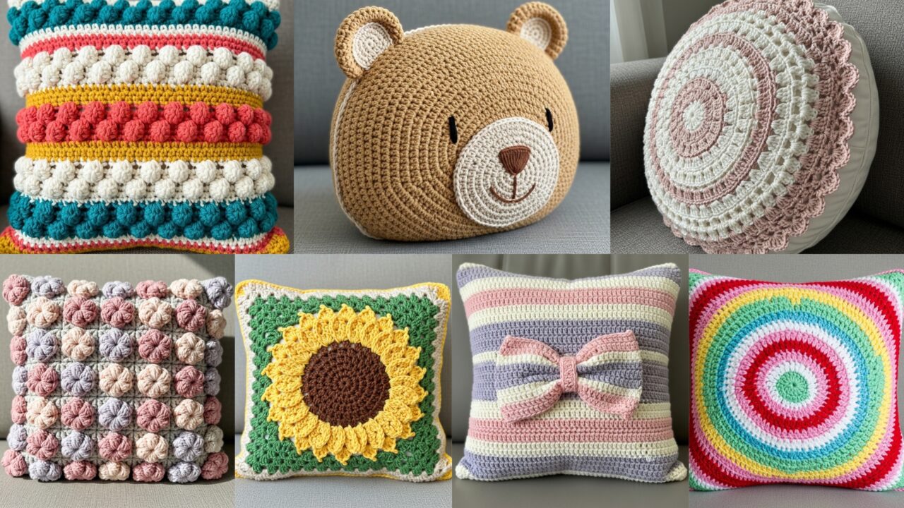 Pillows are one of the fastest and most rewarding home-decor projects — they’re tactile, instantly update a room, and let you show off color, texture and stitch skills. Below you’ll find a full blog-ready post: a practical introduction (materials, sizing, stuffing, gauge, finishing, care), then seven complete pillow patterns with materials, finished-size examples, stitch notes/abbreviations, and step-by-step construction and assembly for each design: Puff Flowers, Stripy Cushion with Giant Bow, Swirly Candy, Bear Head, Sunflower Granny Square, Round Granny, and Bobble Stitch Striped. The tone is friendly and clear — everything written so you (and your readers) can follow it and customize easily.