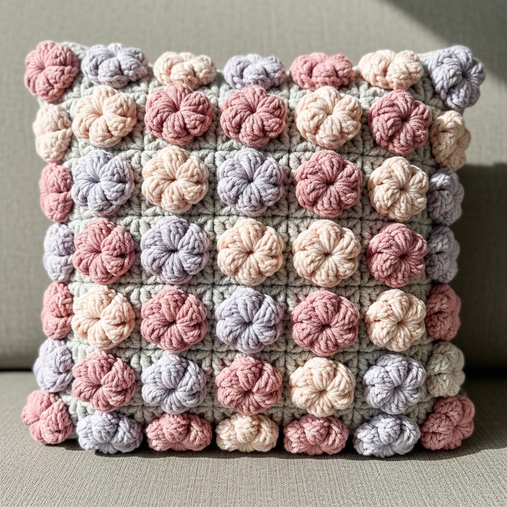 These seven pillow patterns span whimsical (Bear Head, Puff Flowers), playful (Stripy Bow, Swirly Candy), classic (Sunflower Granny, Round Granny), and textural (Bobble Striped) styles — so there’s something for every room in your home. Start by choosing the size and yarn that matches your decor needs, swatch your stitch to confirm gauge, and pick a finishing method (envelope or zipper) that suits your use.