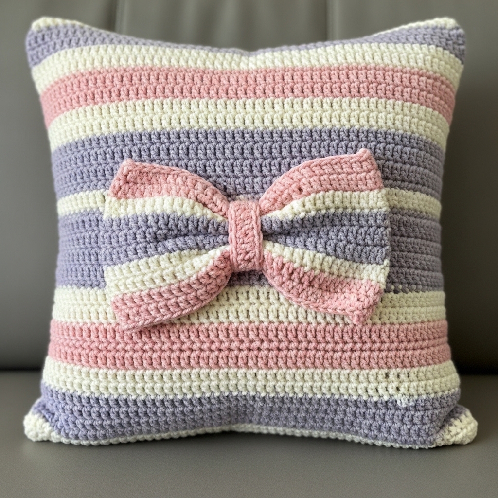 2. Crochet Stripy Cushion Pillow with a Giant Bow Pattern