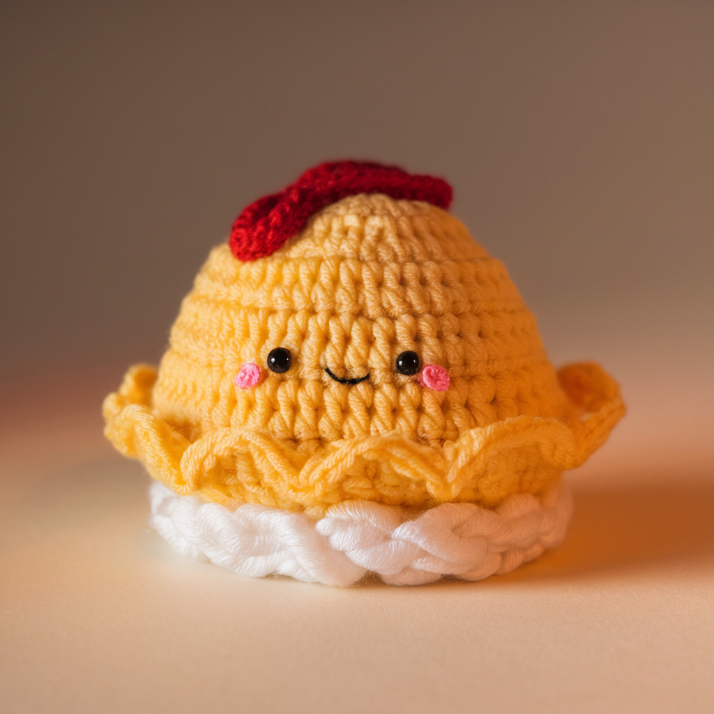 - Yellow yarn (omelette), small amount red or brown for ketchup drizzle, hook 2.5–3.0 mm