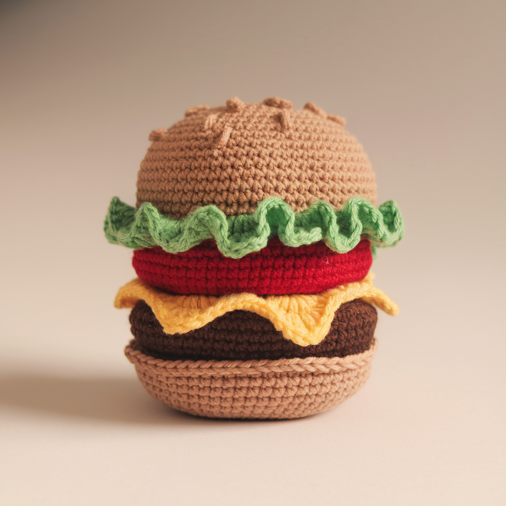 - Light brown/tan (bun), dark brown (patty), yellow (cheese), green (lettuce), red (tomato), DK yarn, hook 2.5–3.0 mm