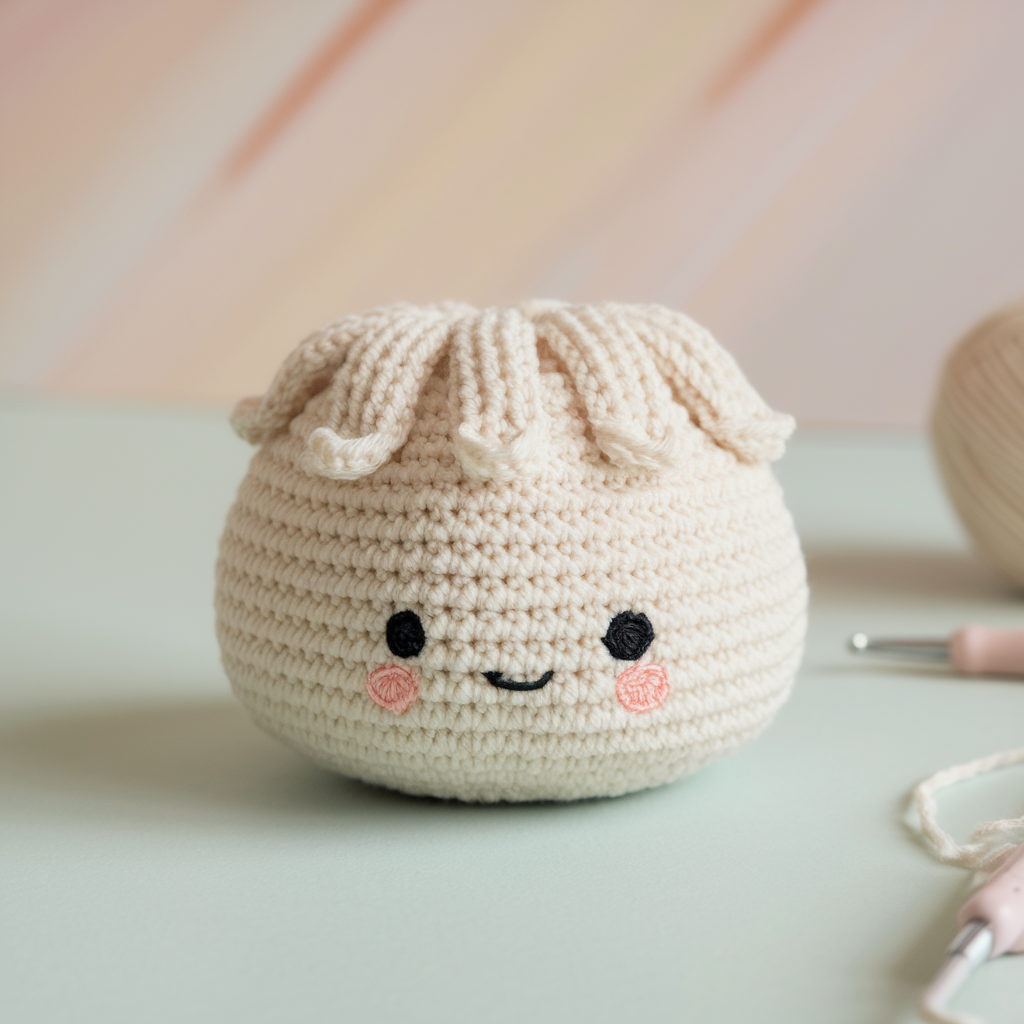 A tiny, pillowy momo/dumpling — very forgiving shape; good for beginner amigurumi shaping practice.