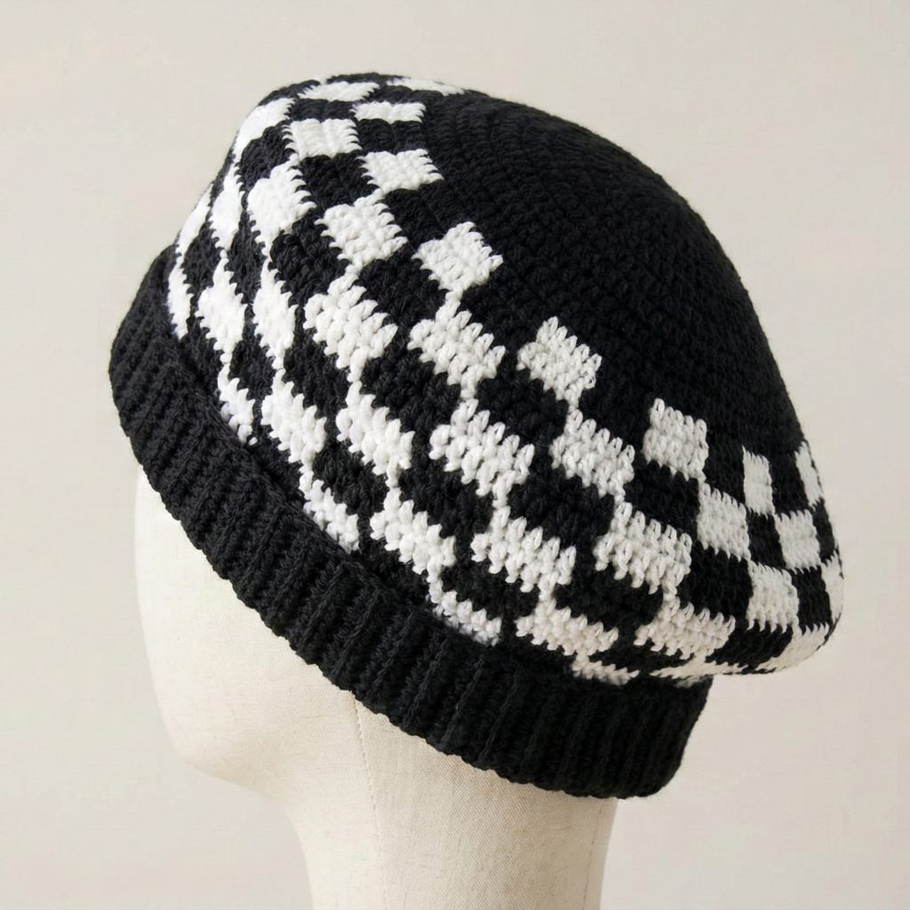 A bold, retro checkered motif worked in tapestry or mosaic technique for a modern mod beret.