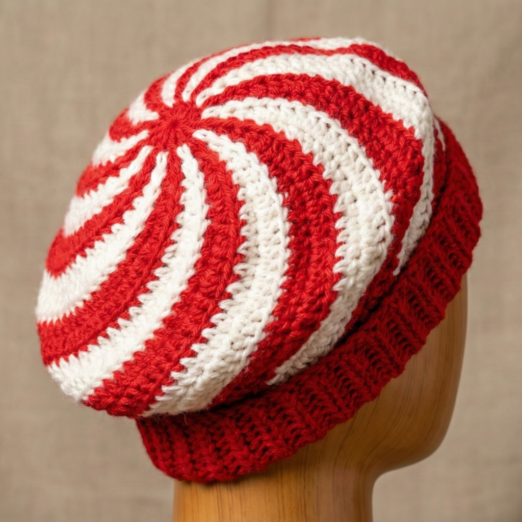 A festive, graphic beret with a spiral swirl pattern reminiscent of peppermint candy. Color changes make a striking statement.