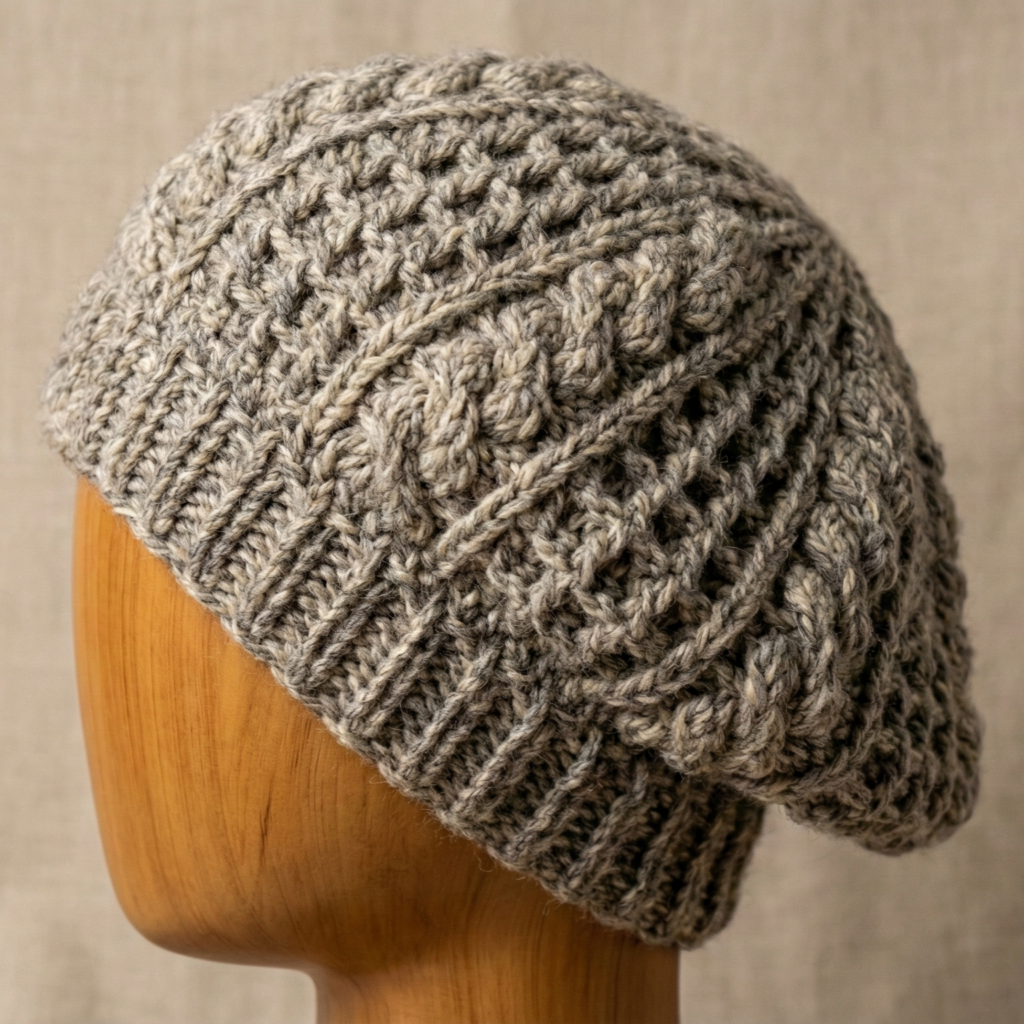 A cozy, tactile beret that showcases texture stitches — waffle, cable-ish post stitches, or popcorn rows — ideal for winter warmth.