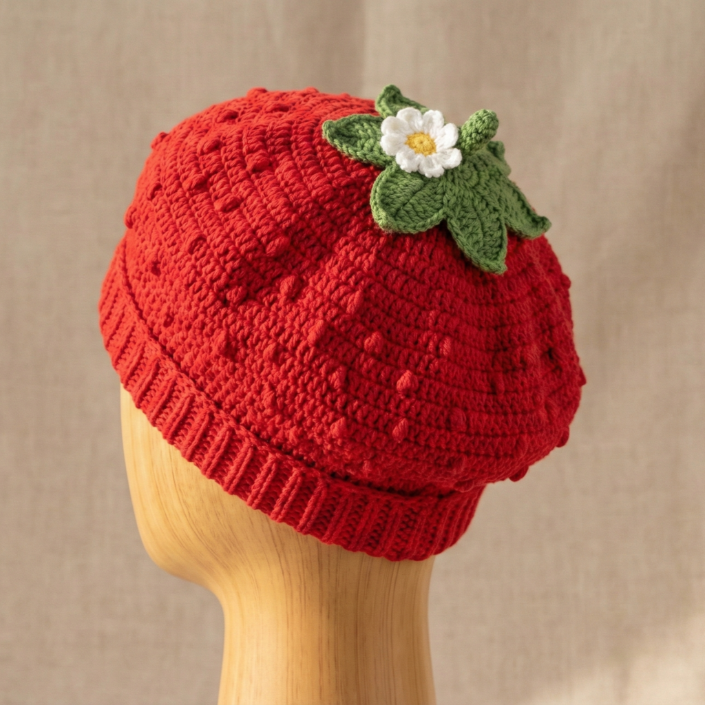 A sweet summer-ready beret topped with tiny daisy motifs and a strawberry motif appliqué — feminine and fresh.