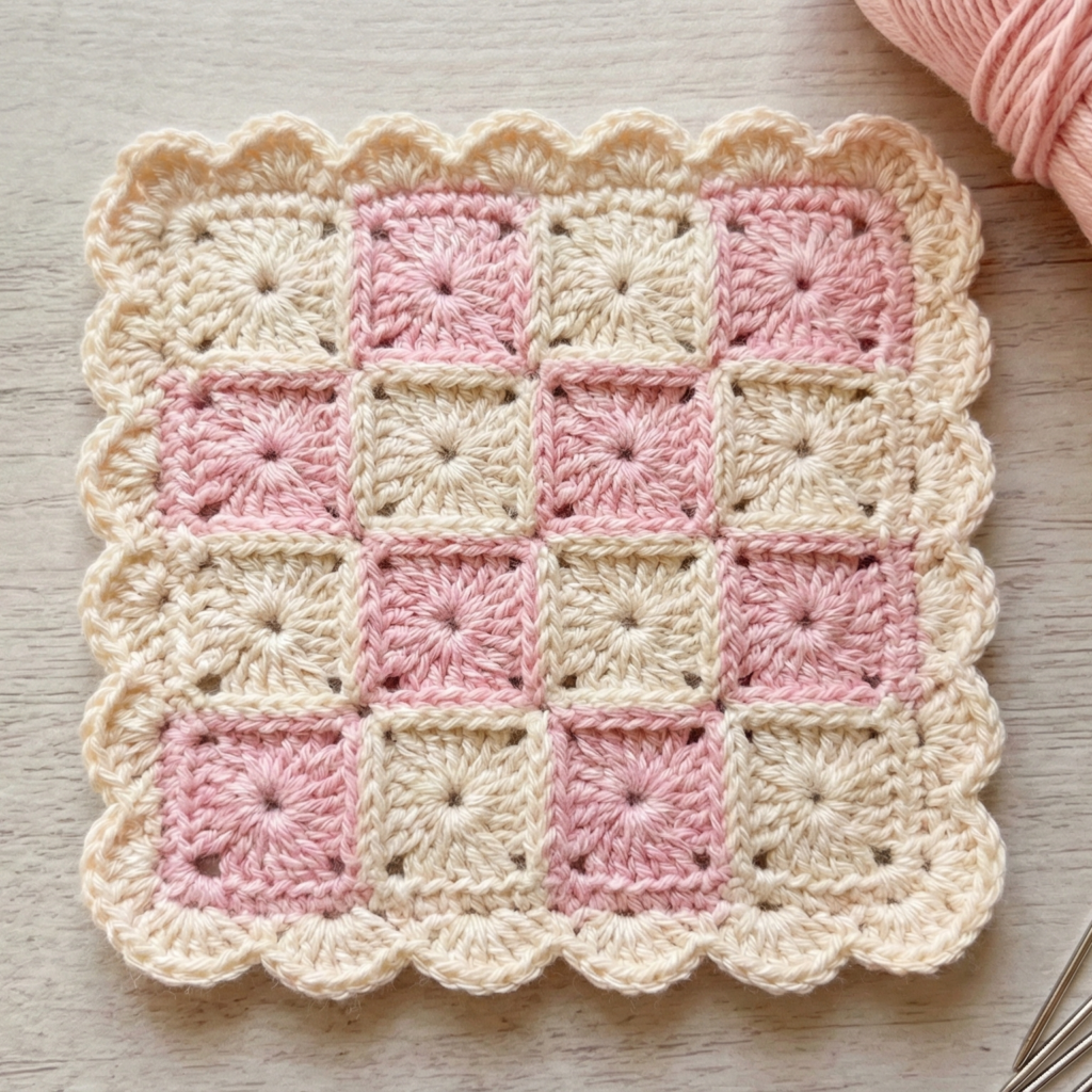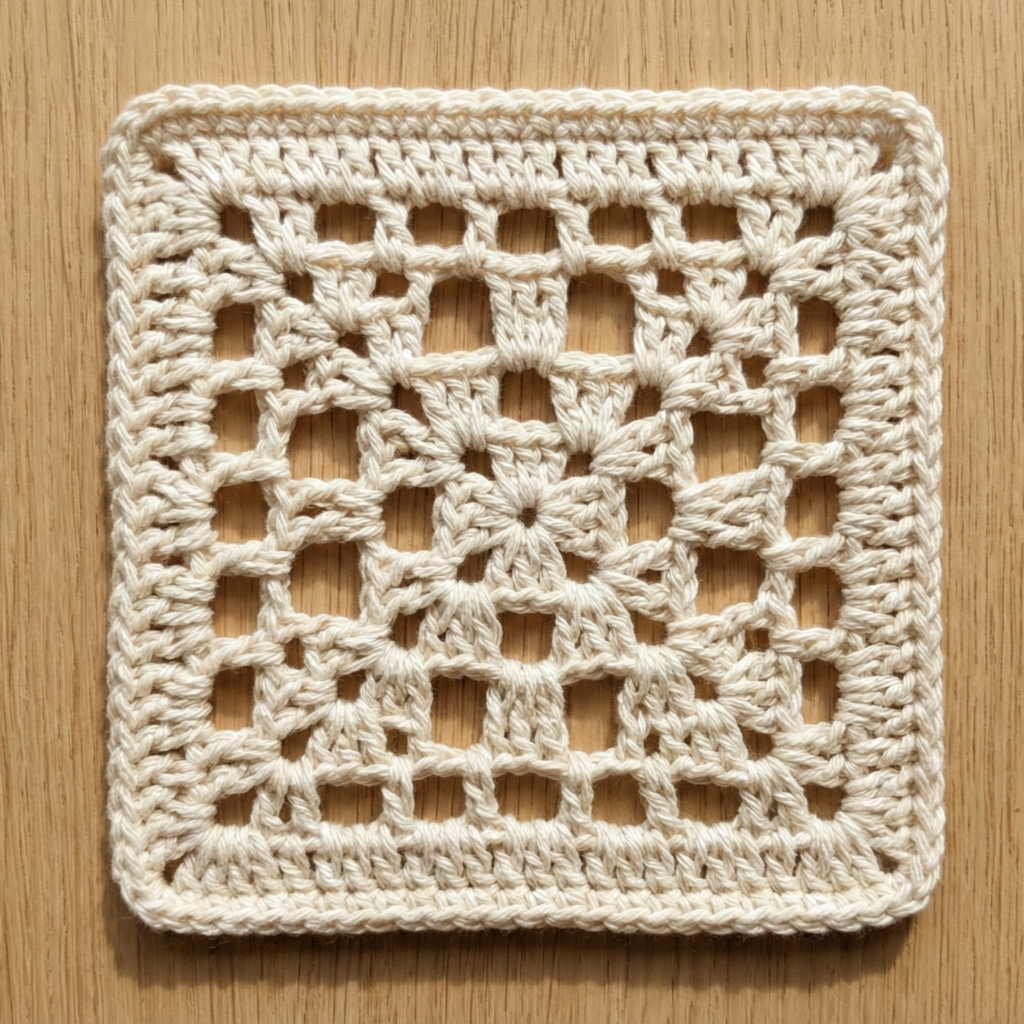 5. After lattice height is achieved, work 2–3 rounds sc around the whole square (work across ends) to tidy. Use corner increases (3 sc in corner) to keep shape square.
