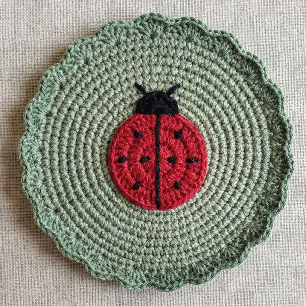 1. Crochet Ladybug Coaster with Shell Stitch Border Pattern