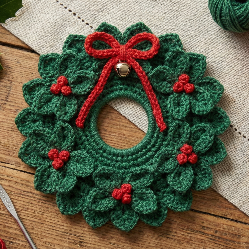 Materials: DK cotton in deep green, small red for berries, 3.5–4.0 mm hook, optional tiny jingle bell (sewn securely, not for young children)