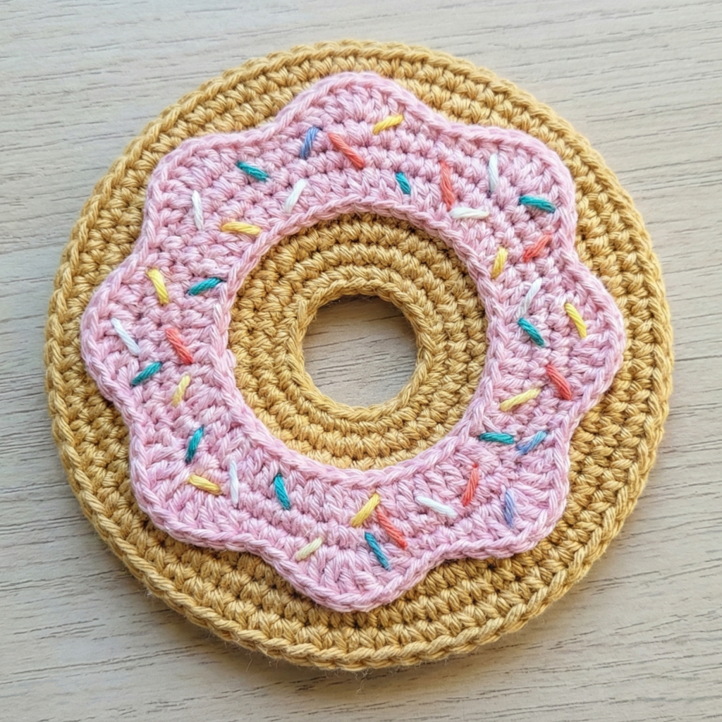 Materials: worsted or DK cotton (main + icing color), 4.0 mm hook, embroidery floss for sprinkles (optional)