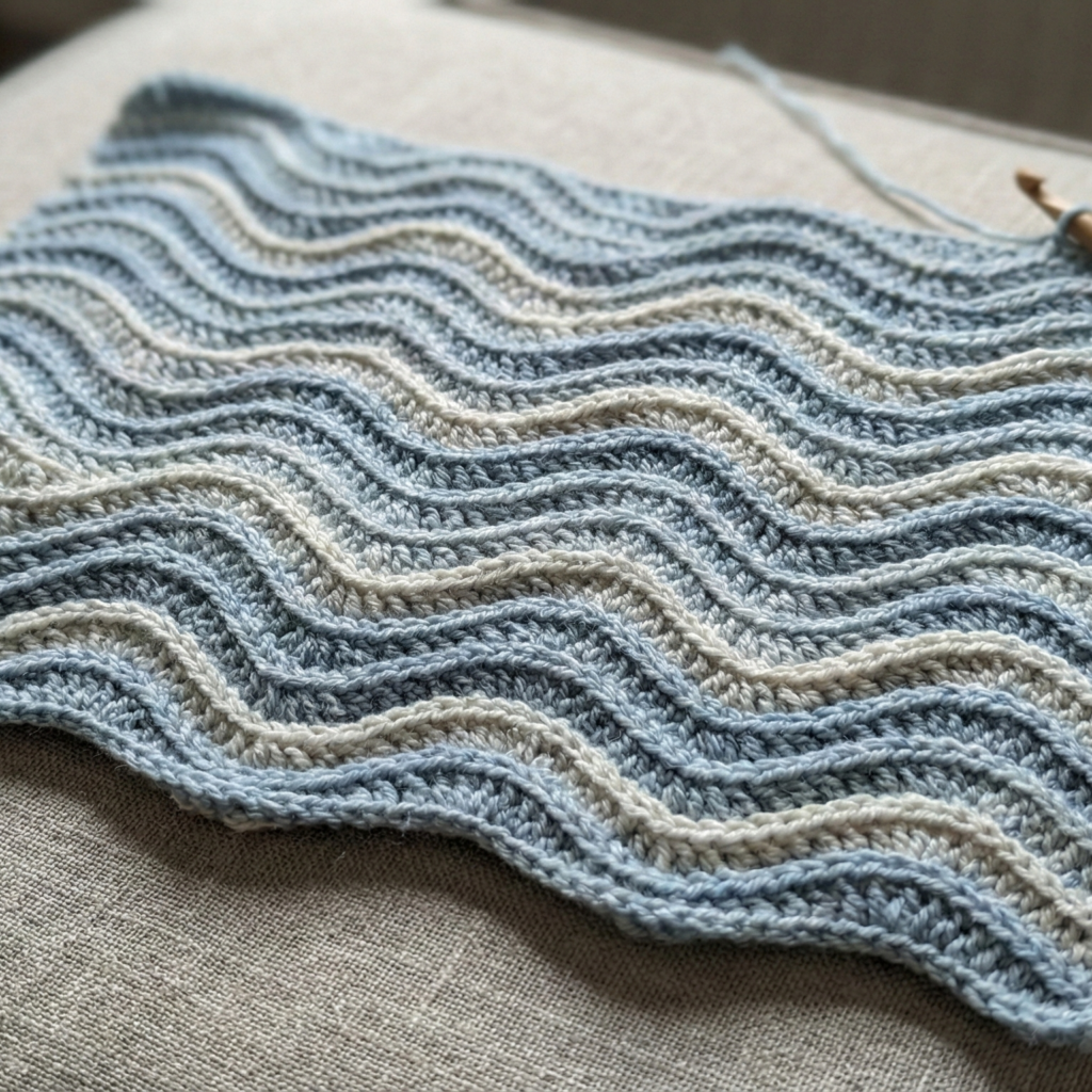 The wave is achieved by using long chains and elongated stitches combined with groups of dc to form crest and trough. The effect is a smooth sine-wave across the row.