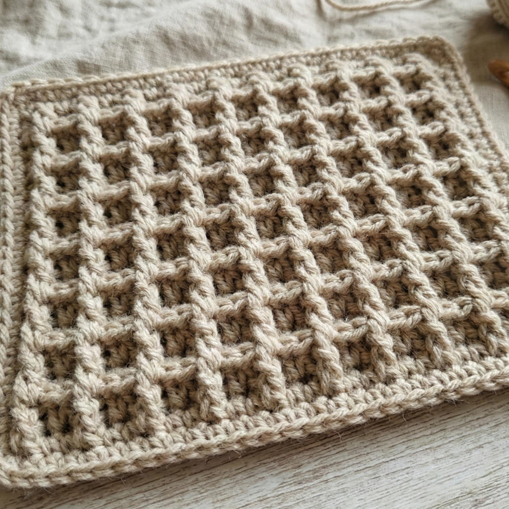 Row 4: ch 2, fpdc around the next fpdc post (from Row 2), fpdc around the post two rows below to create the double grid effect, bpdc around the next bpdc — this row is the “double” cross-link that deepens the waffle. (If you prefer a simpler version, use: fpdc in next st, bpdc in next st across as Row 2.)