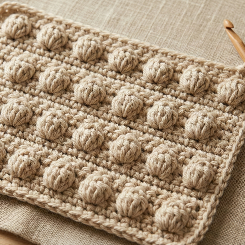 Row 3: ch 1, sc across (working sc into top of beans carefully — you can work sc into the center of each bean or into the next normal stitch so the bump shows on the RS).
