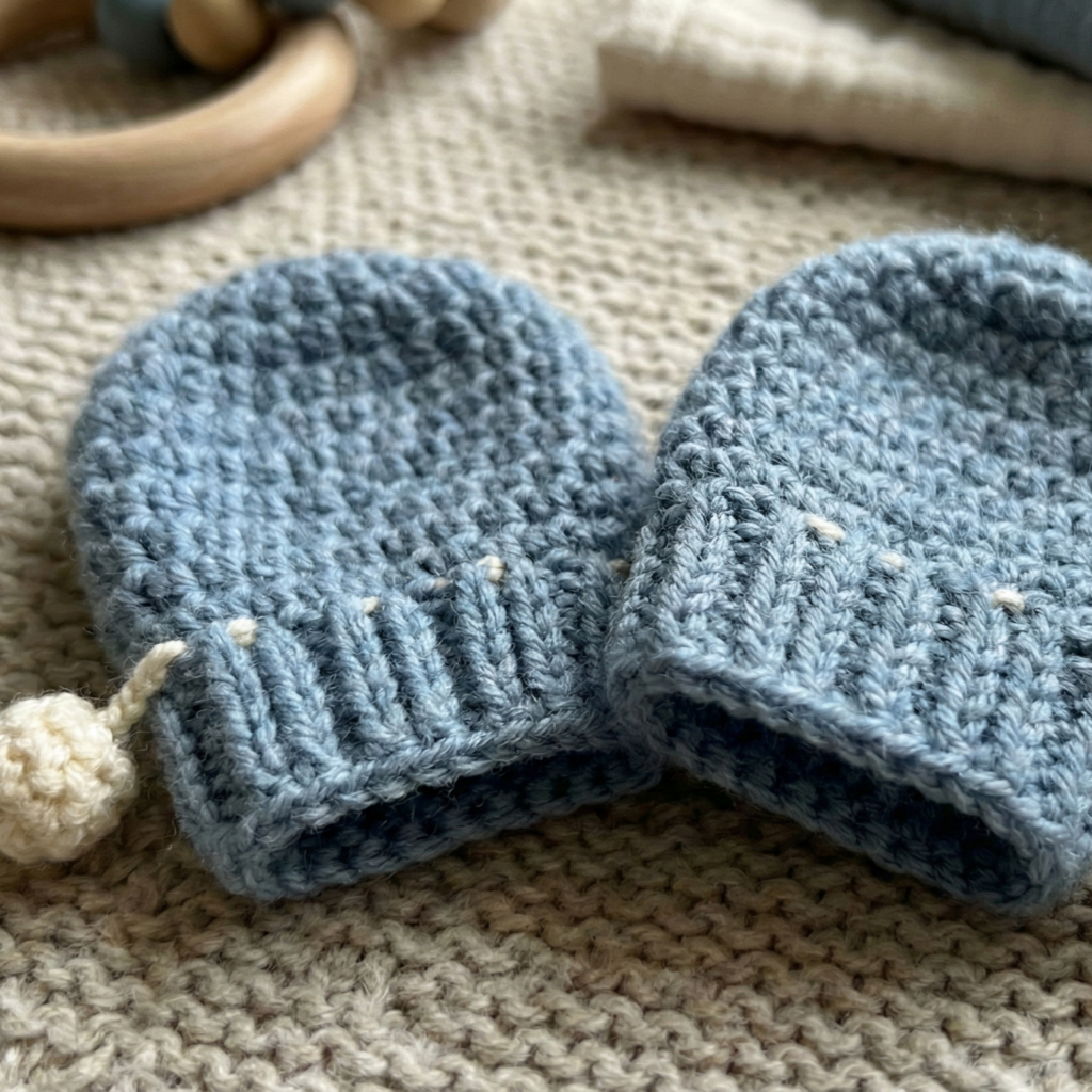 Finished size (newborn): Palm circ. ≈ 3.5–3.75 in; length ≈ 3.0–3.25 in.