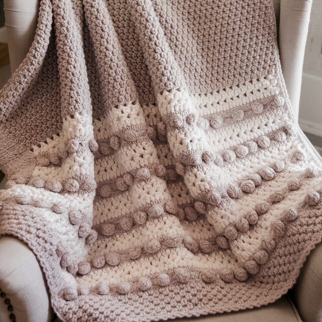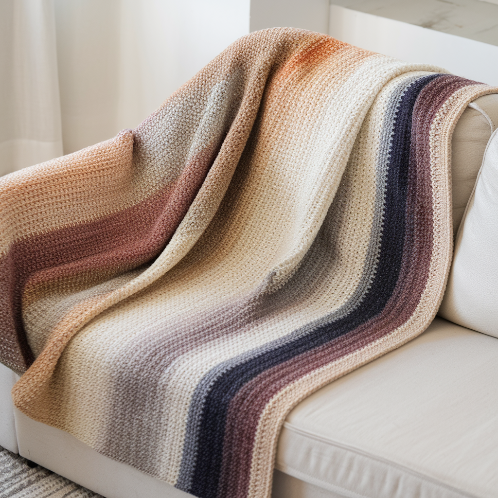 Overview & style: A soft, subtle gradient blanket that mimics the horizon — horizontal color transitions using gradient yarns or carefully planned stripes that shift tone slowly. Very calming visually.