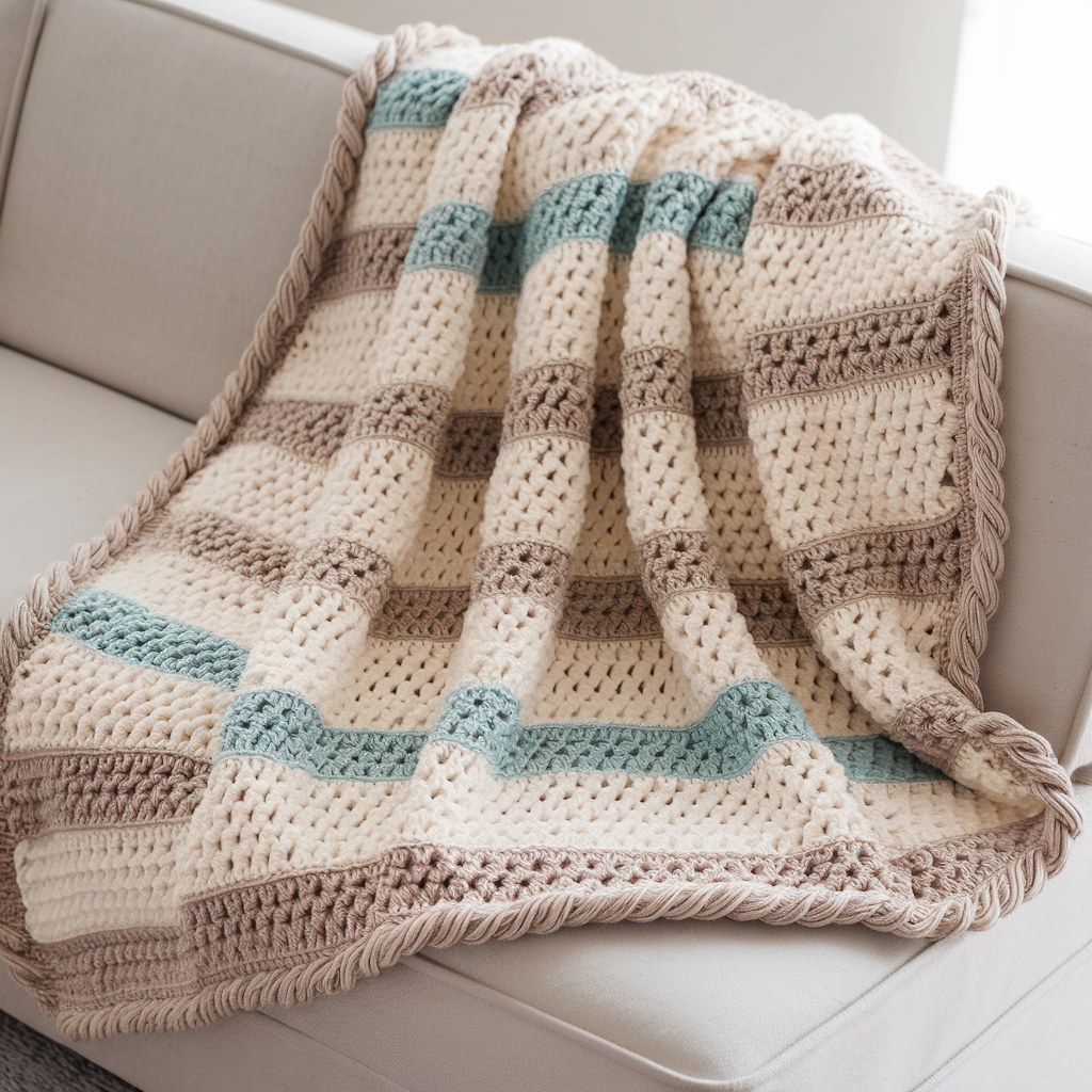 - Border: Work 2 rounds sc around entire blanket, then open-shell round or crab stitch for a modern finish.