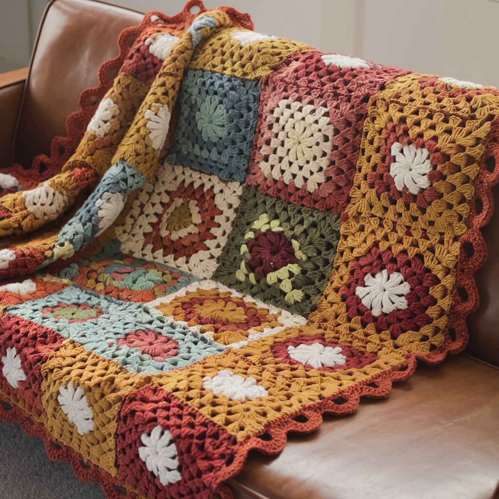 - Make a classic granny square or vintage ripple square in your color palette (each square ~4–6 in blocked).