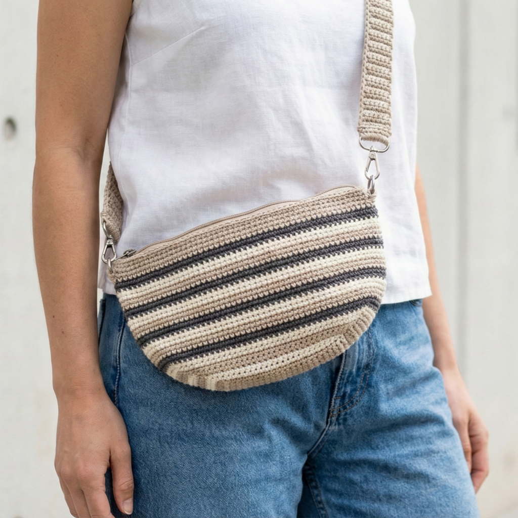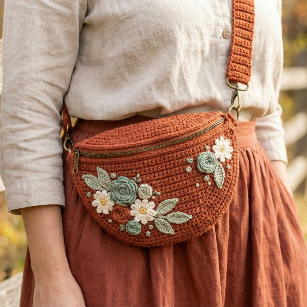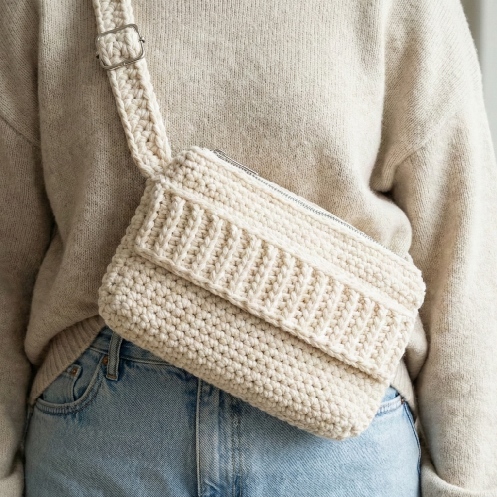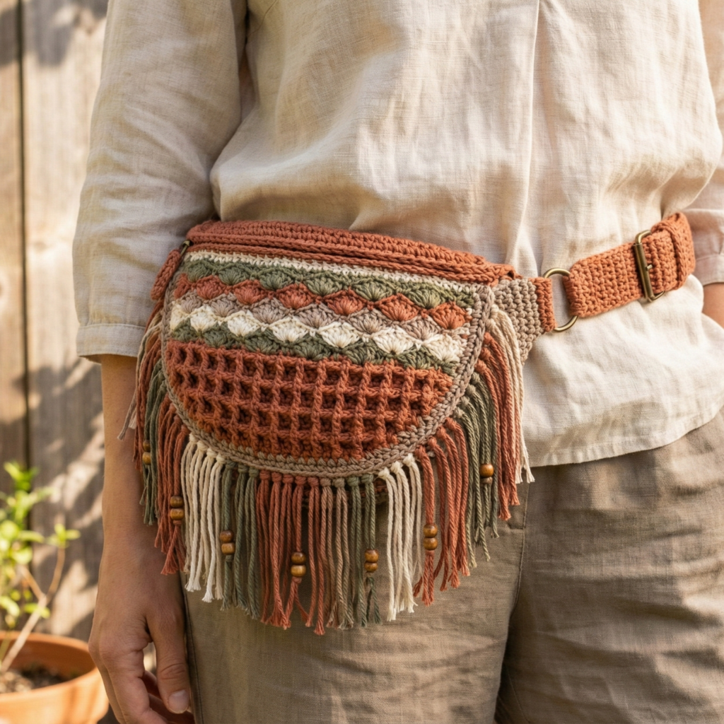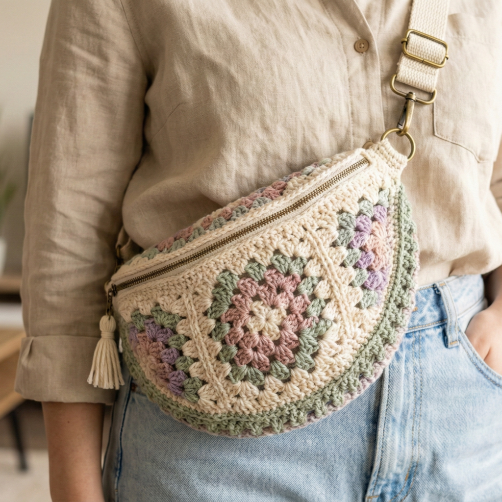 Waist bags / crossbody bum bags are back — they’re convenient, hands-free, and a perfect small project to show off texture, colorwork, or granny motifs. Below you’ll find a friendly introduction (materials, sizing, straps, closures, lining & care) and seven full bag patterns with clear materials lists, stitch notes, step-by-step construction, finishing tips, and styling ideas. Each pattern is written so you can follow it from start to finish and customize easily.