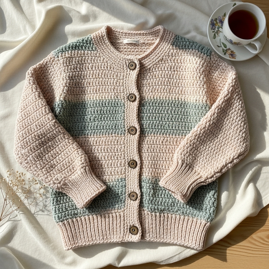 - Work buttonband integrated in the last rounds: when you finish body, sc around front edges with evenly spaced buttonholes (ch3 loops) for large buttons.