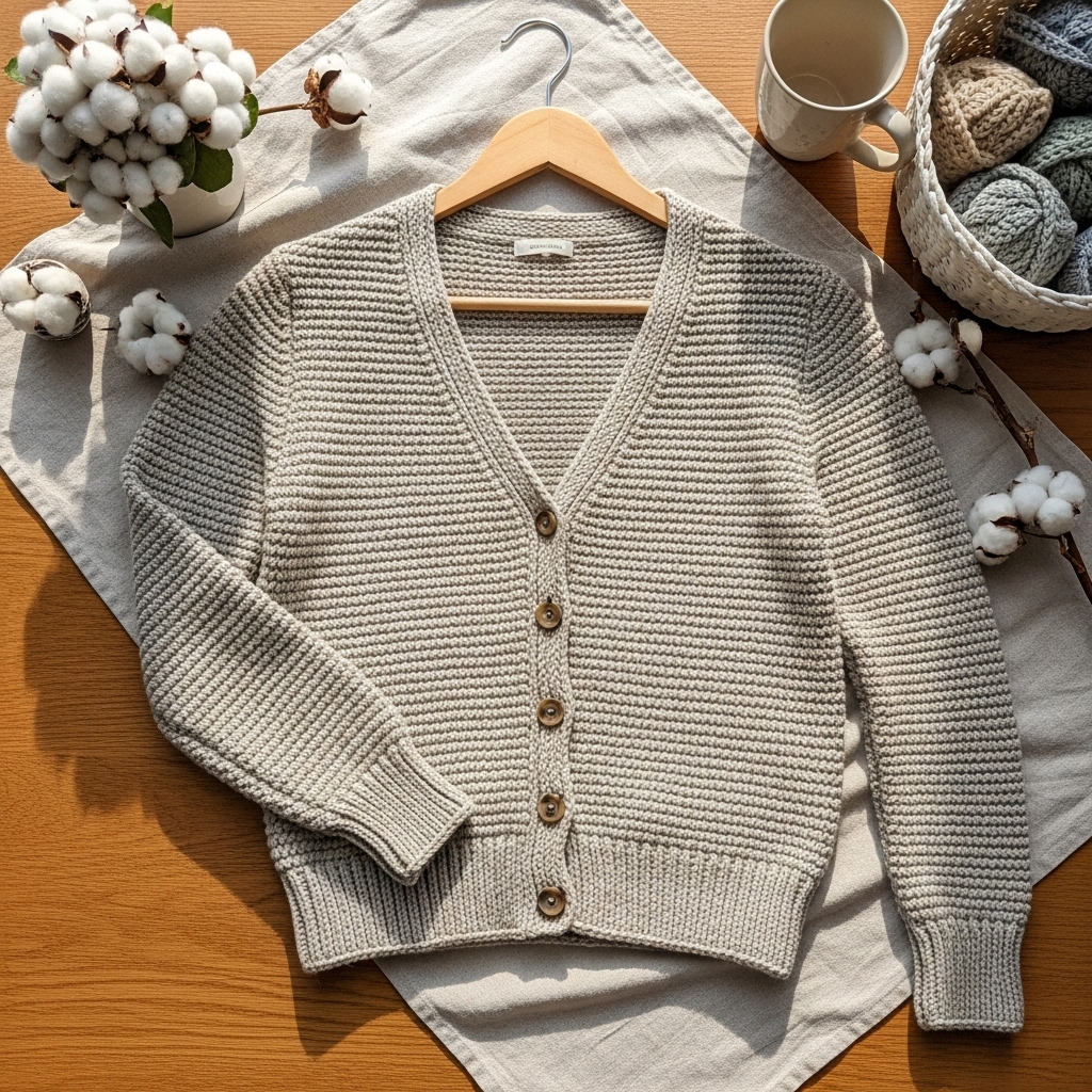 Mood & silhouette: A classic button-down cardigan with clean banded front, optional pockets, and versatile length.