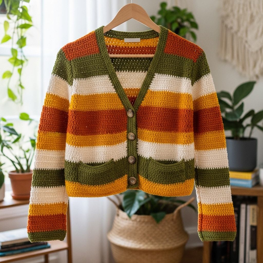 Mood & silhouette: 1970s-inspired retro cardigan with bold stripes, flared sleeves or slightly boxy shape, and decorative yoke or patch pockets.