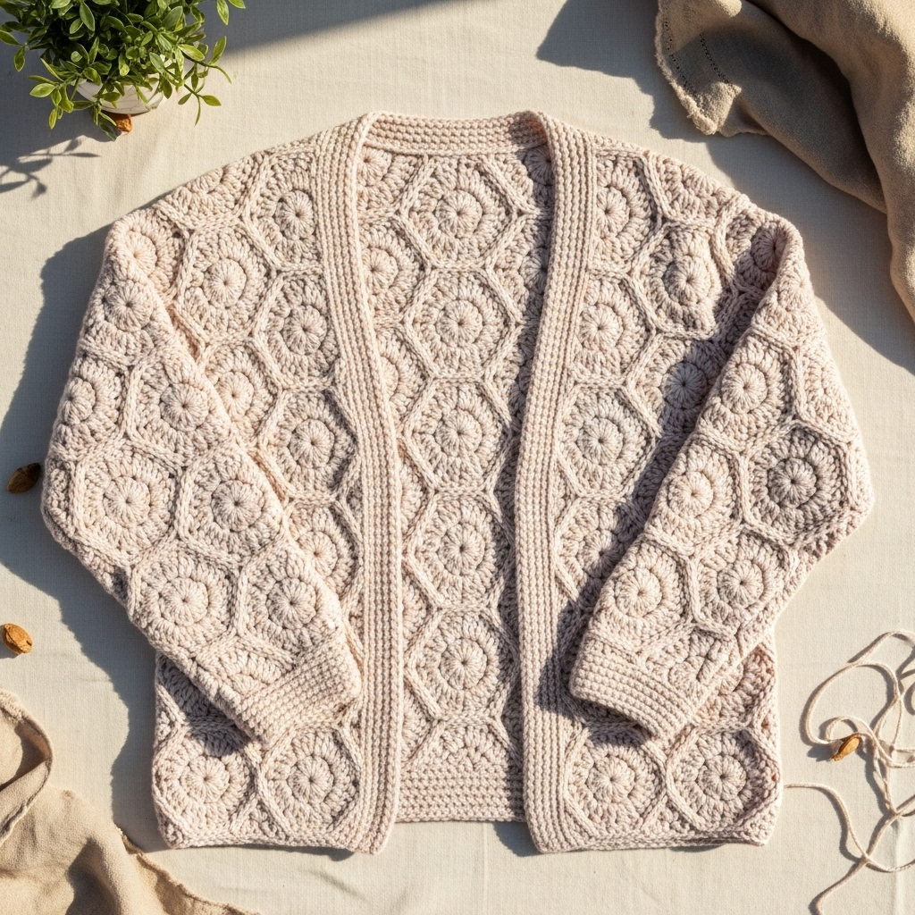 Mood & silhouette: Retro, playful, and perfect for layering: a cropped cardigan built from hexagon motifs—granny-style but hexagonal for modern tessellation.