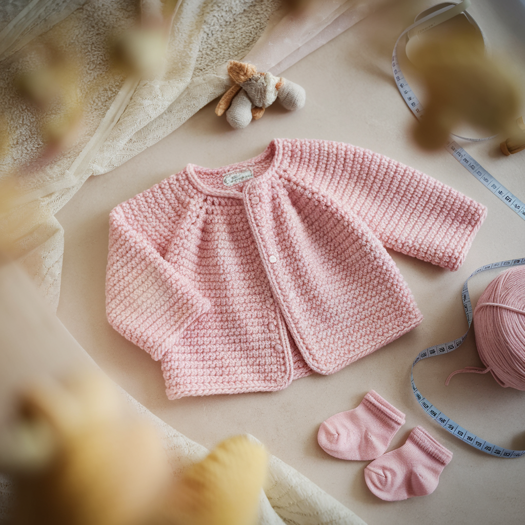 A pink baby cardigan is a timeless, practical gift. Use gentle yarn and minimal closures for safety and comfort.