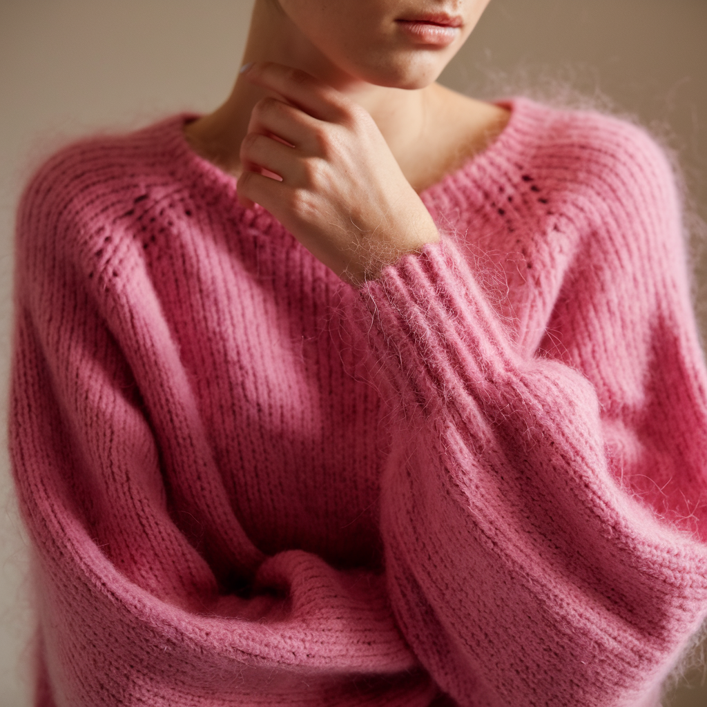 A soft fluffy mohair sweater in pale pink is dreamy and elevated. The mohair halo traps warmth and light; pairing it with a solid strand adds stitch definition. Keep a loose gauge for drape.