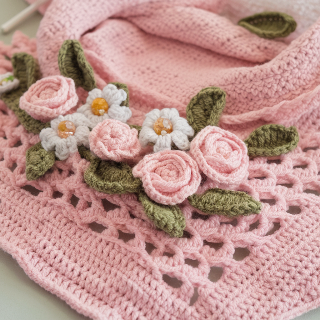 - Greenery (optional). Add small chain leaves and sew them behind blossoms for depth: ch 6, sc, hdc, dc, hdc, sc — sew to the scarf.