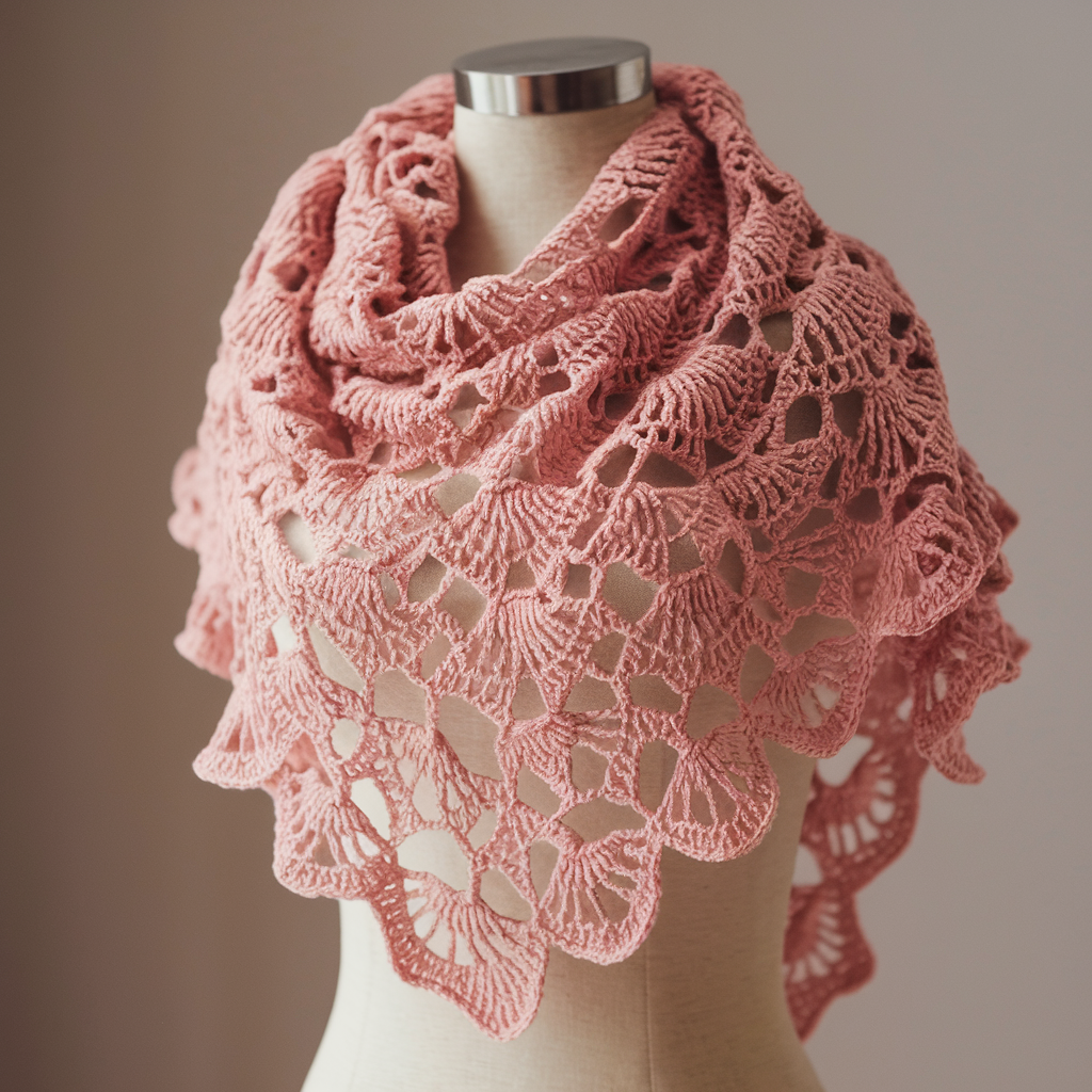 Stitches & techniques: shell/petal repeats, ch-spaces, and simple increases for triangular shaping.