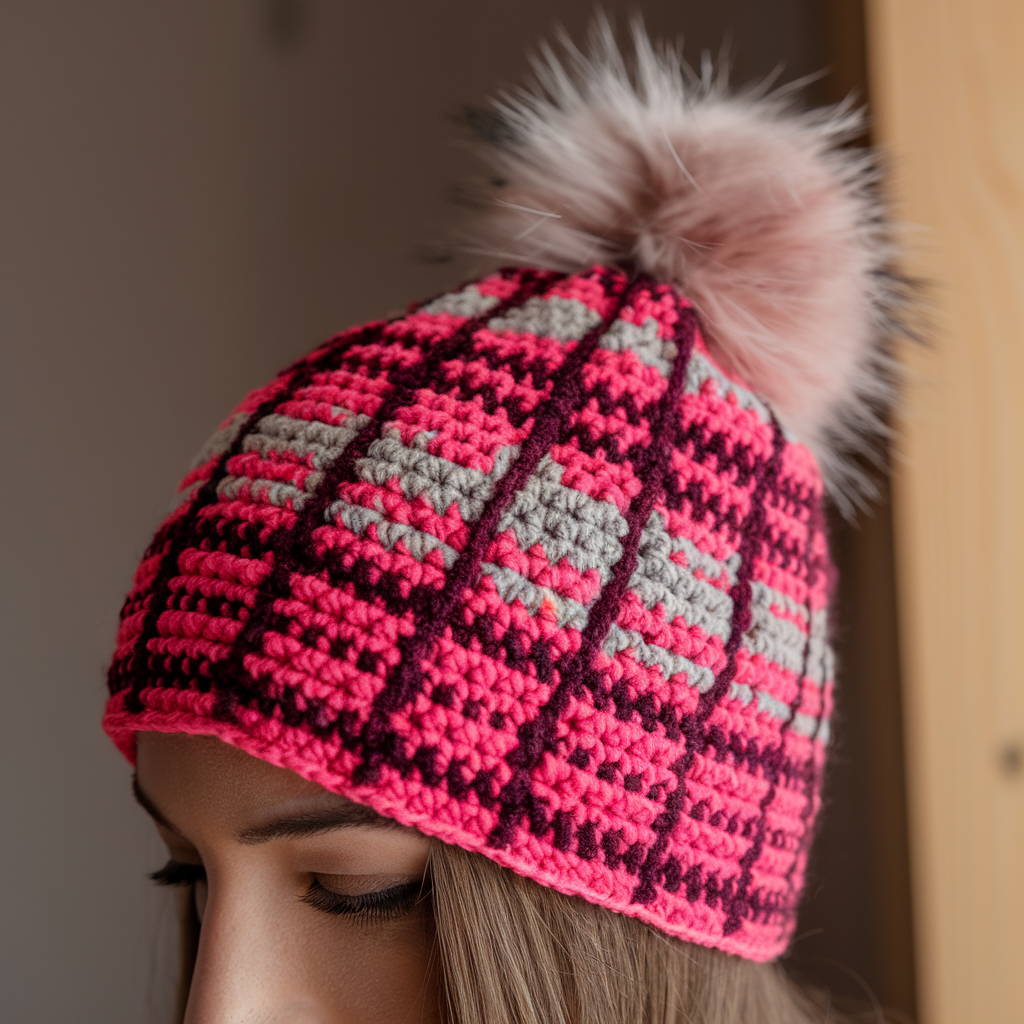 Techniques: worked in the round from crown down, basic color changes, and optional surface slip stitch to create plaid lines.