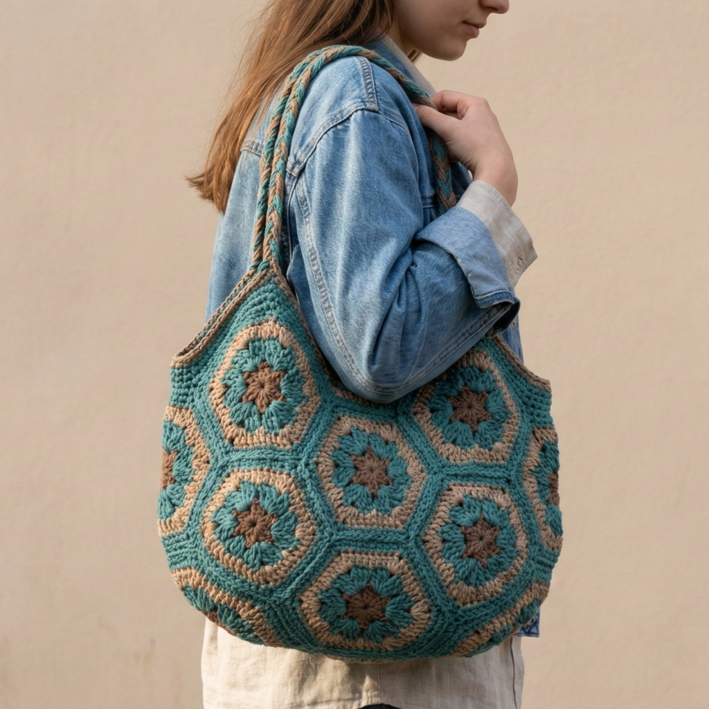 A modern market tote assembled from hexagon motifs — geometric and great for colourwork.