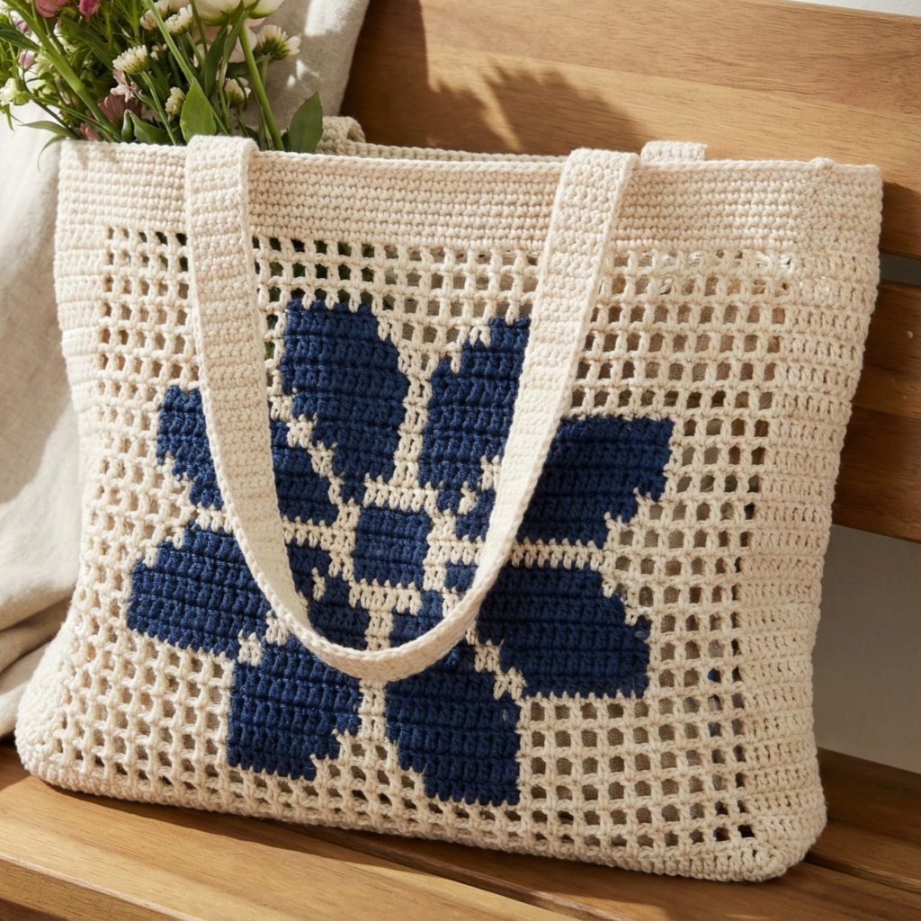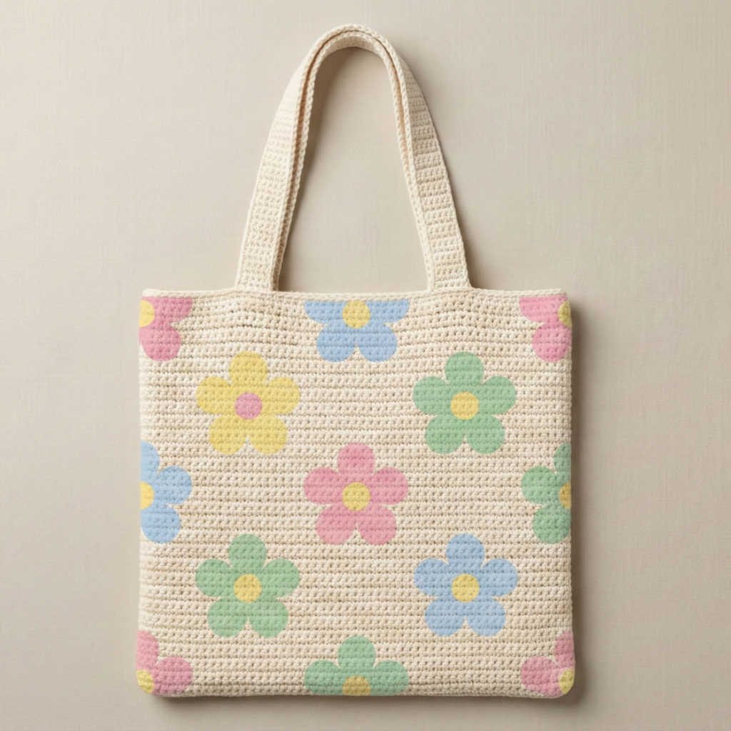 A flat-panel tote featuring crocheted applique flowers on a solid background — easy to customise with colour and floral placement.