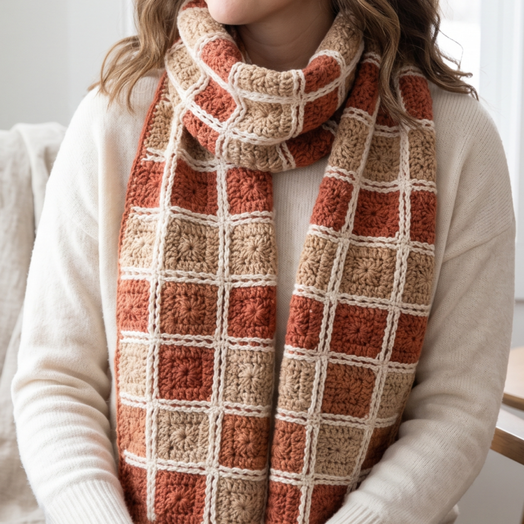 Work the scarf in rows using a stitch pattern that lies flat and shows the color changes clearly. Single crochet, half double crochet, or double crochet all work well. Keep your edges straight so the tartan pattern stays neat.
