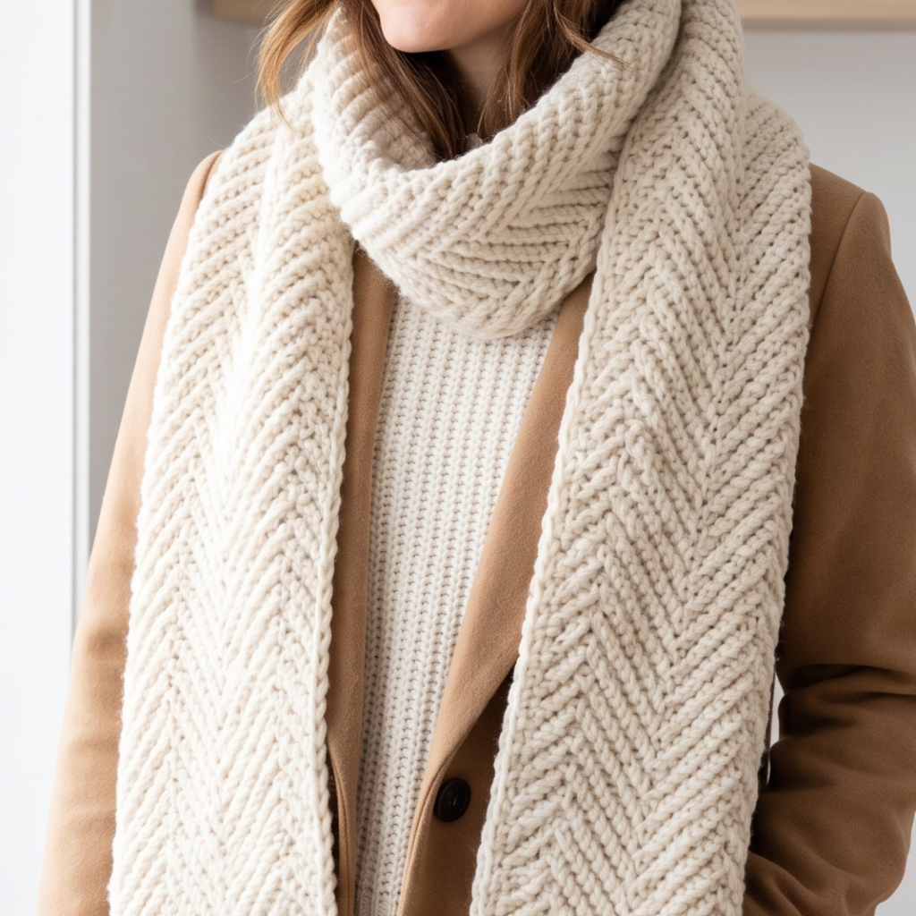 The bulky herringbone stitch scarf is warm, modern, and beautifully structured. Herringbone stitch creates a subtle diagonal texture that looks clean and sophisticated, and when worked in bulky yarn, it becomes extra cozy and quick to make. This pattern is perfect if you want a scarf that feels luxurious and winter-ready.