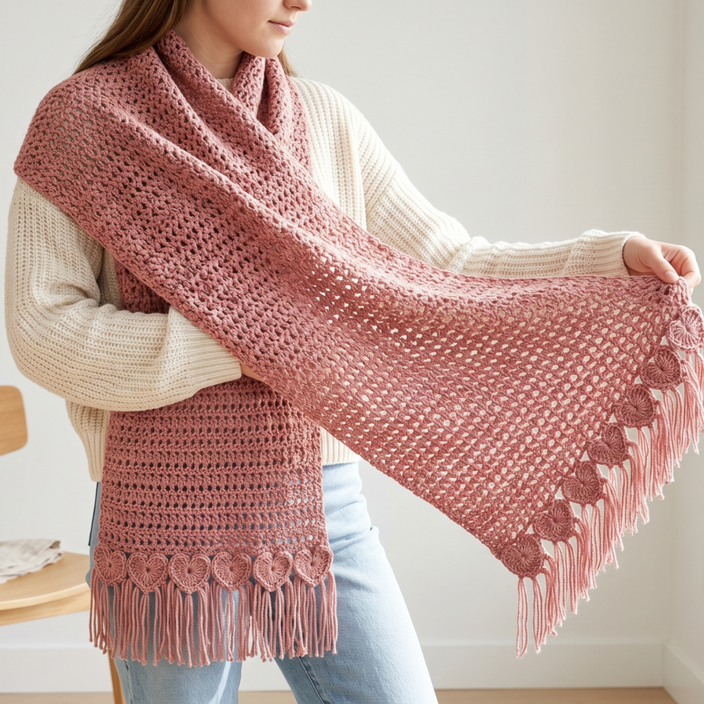 The V-stitch heart fringes scarf is playful, romantic, and full of charm. V-stitch creates open, flowing texture, while heart accents and fringes bring a sweet, decorative touch. This scarf is perfect if you want something soft and feminine with a handmade feel that stands out.