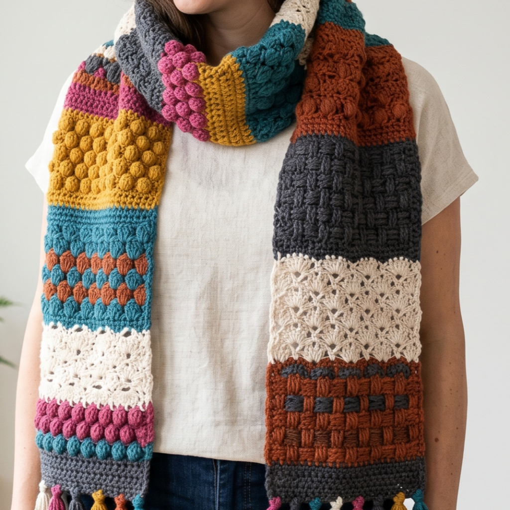You can mix simple and textured stitches to create contrast. For example, one section might use block stitch, another might use bobbles, and another might use open lace. The variety is what makes the scarf feel bold and expressive.