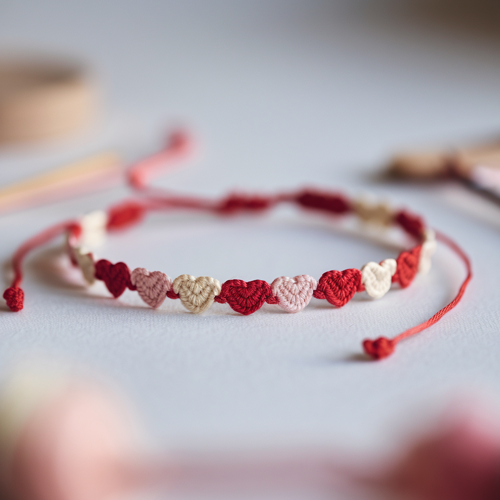 Tiny hearts are a sweet motif that reads clearly even in small scales. There are two main approaches: appliqué hearts sewn onto a base, and knot-formed hearts integrated into the bracelet rows. Below is a direct knot sequence for small hearts.