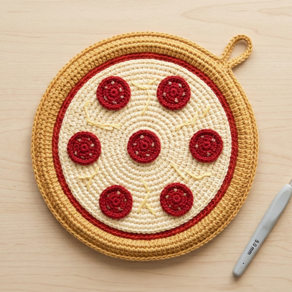 - Worsted cotton: beige/cream for crust, light tan for base, red for sauce/pepperoni, dark brown for crust edge (optional), 5.0 mm hook