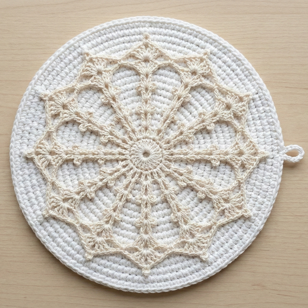 Work a solid round base for heat resistance, then crochet a lacy snowflake motif on top (or work the snowflake integrated into the final rounds). Back with Insul-Bright.