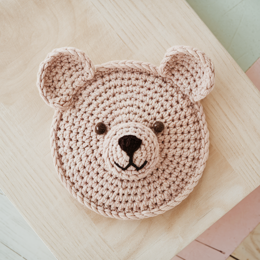Make a flat round for the coaster body, add two small ear appliqués, and optionally embroider a nose/face or add tiny felt pieces.