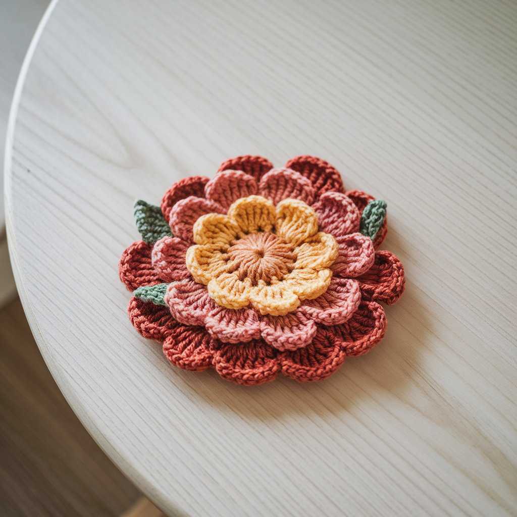- Repeat petal rounds until diameter ~4″. Fasten off and weave ends.
