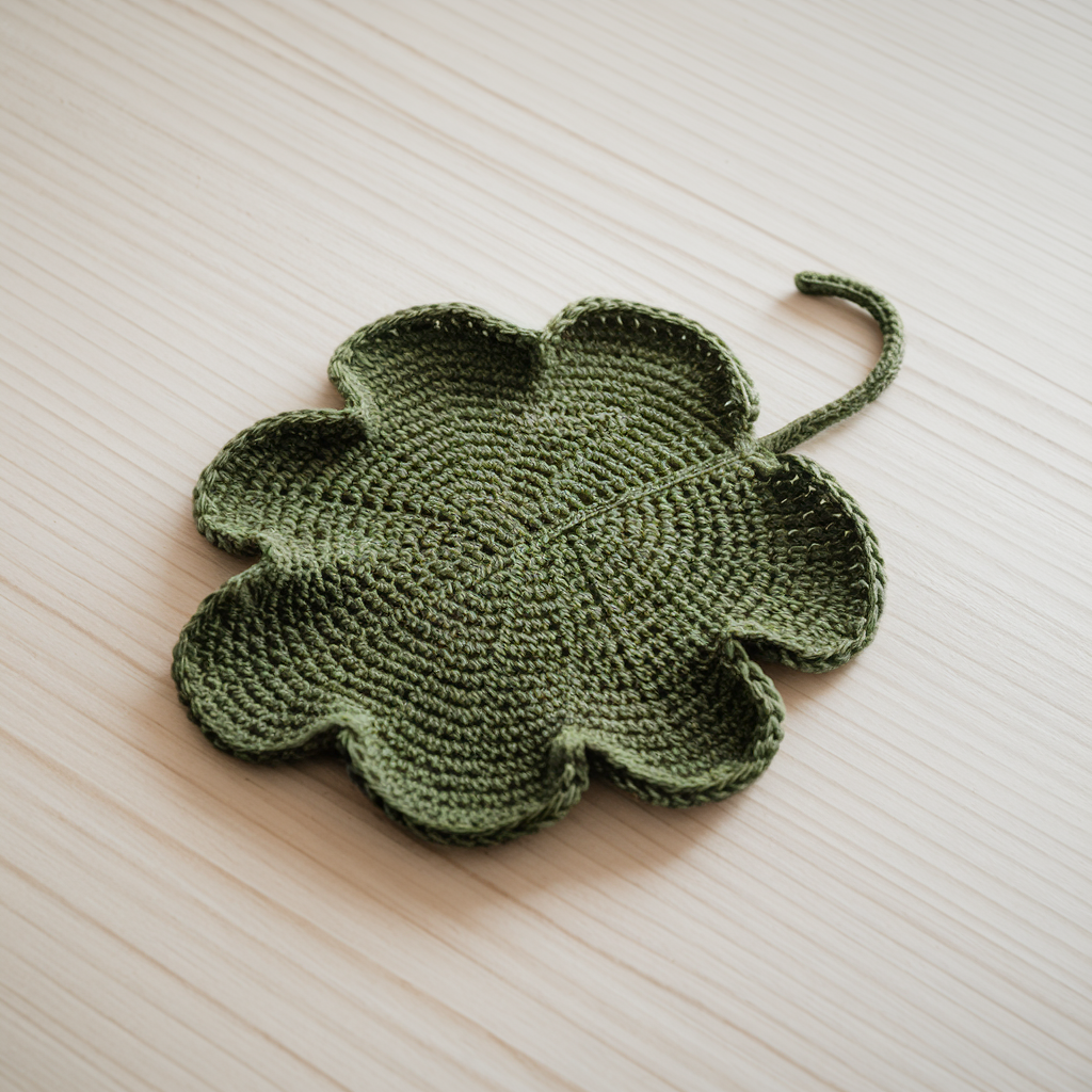 - For a sturdier coaster, make two leaves and join them (wrong sides together) with sc and stuff lightly with batting — gives insulating thickness.